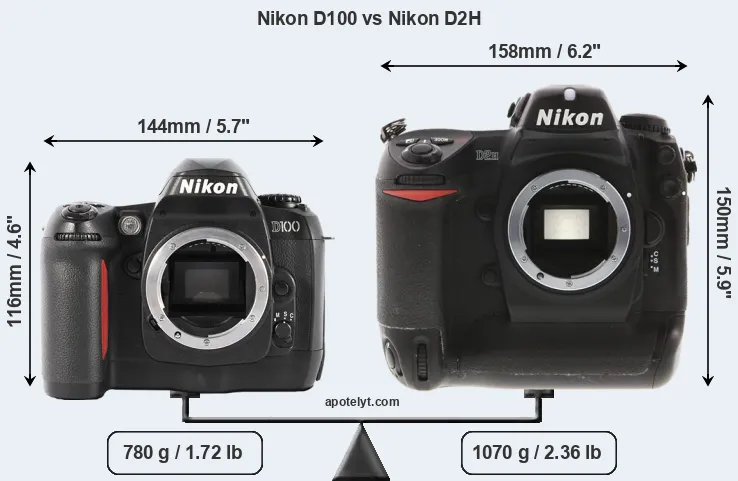 If the front view area (width x height) of the cameras is taken as an aggregate measure of their size, the Nikon D2H is notably larger (42 percent) than the Nikon D100. Moreover, the D2H is substantially heavier (37 percent) than the D100. It is noteworthy in this context that the D2H is splash and dust-proof, while the D100 does not feature any corresponding weather-sealing.