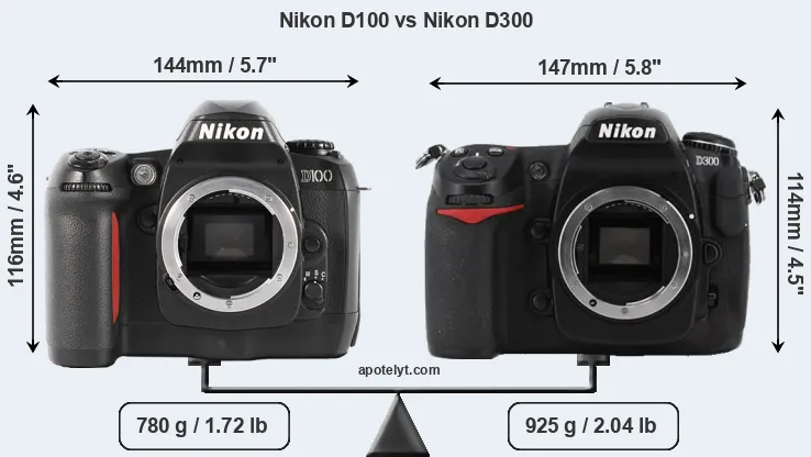 An illustration of the physical size and weight of the Nikon D100 and the Nikon D300 is provided in the side-by-side display below. The two cameras are presented according to their relative size. Three consecutive views from the front, the top, and the rear side are shown. All width, height and depth measures are rounded to the nearest millimeter.