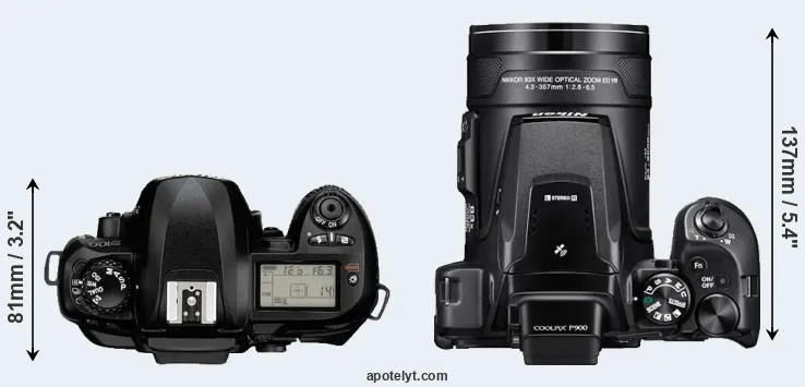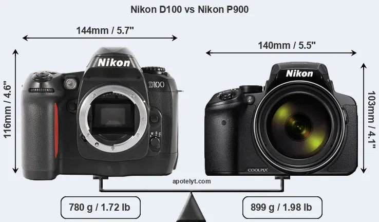 The side-by-side display below illustrates the physical size and weight of the Nikon D100 and the Nikon P900. The two cameras are presented according to their relative size. Three consecutive views from the front, the top, and the rear side are shown. All width, height and depth dimensions are rounded to the nearest millimeter.
