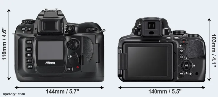 The above size and weight comparisons are to some extent incomplete and possibly misleading, as the P900 has a lens built in, whereas the D100 is an interchangeable lens camera that requires a separate lens. Attaching the latter will add extra weight and bulk to the setup. You can compare the optics available for the D100 and their specifications in the Nikon Lens Catalog.