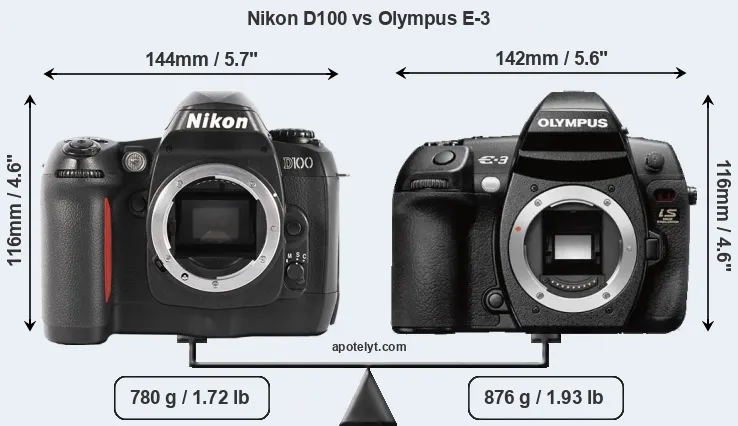 If the front view area (width x height) of the cameras is taken as an aggregate measure of their size, the Olympus E-3 is somewhat smaller (1 percent) than the Nikon D100. However, the E-3 is markedly heavier (12 percent) than the D100. It is noteworthy in this context that the E-3 is splash and dust-proof, while the D100 does not feature any corresponding weather-sealing.