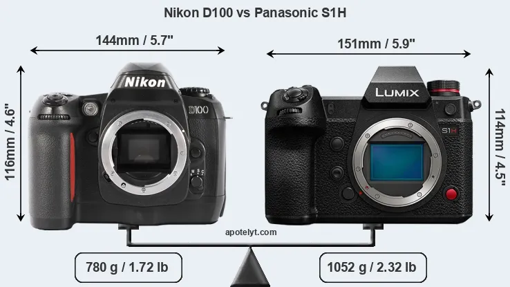 If the front view area (width x height) of the cameras is taken as an aggregate measure of their size, the Panasonic S1H is somewhat larger (3 percent) than the Nikon D100. Moreover, the S1H is substantially heavier (35 percent) than the D100. It is noteworthy in this context that the S1H is splash and dust-proof, while the D100 does not feature any corresponding weather-sealing.
