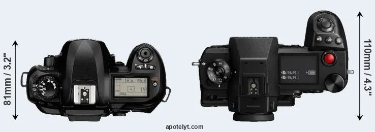 An illustration of the physical size and weight of the Nikon D100 and the Panasonic S1H is provided in the side-by-side display below. The two cameras are presented according to their relative size. Three consecutive views from the front, the top, and the rear side are shown. All width, height and depth dimensions are rounded to the nearest millimeter.