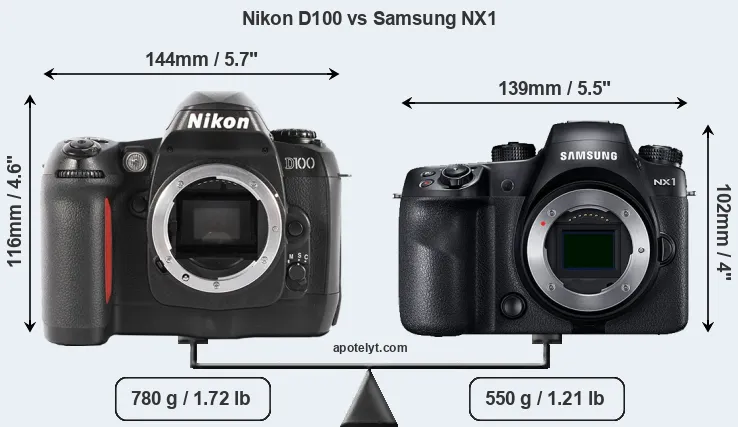 If the front view area (width x height) of the cameras is taken as an aggregate measure of their size, the Samsung NX1 is notably smaller (15 percent) than the Nikon D100. Moreover, the NX1 is markedly lighter (29 percent) than the D100. It is noteworthy in this context that the NX1 is splash and dust-proof, while the D100 does not feature any corresponding weather-sealing.