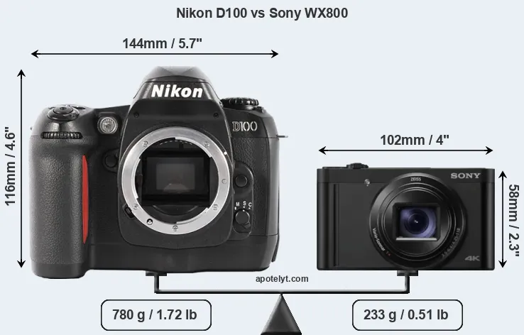 The physical size and weight of the Nikon D100 and the Sony WX800 are illustrated in the side-by-side display below. The two cameras are presented according to their relative size. Three consecutive views from the front, the top, and the rear side are shown. All size dimensions are rounded to the nearest millimeter.