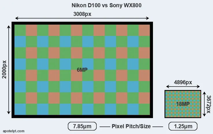 Despite having a smaller sensor, the WX800 offers a higher resolution of 18 megapixels, compared with 6 MP of the D100. This megapixels advantage comes at the cost of a higher pixel density and a smaller size of the individual pixel (with a pixel pitch of 1.25μm versus 7.85μm for the D100). However, it should be noted that the WX800 is much more recent (by 16 years and 7 months) than the D100, and its sensor will have benefitted from technological advances during this time that make it possible to gather light more efficiently. Coming back to sensor resolution, it should be mentioned that the WX800 has no anti-alias filter installed, so that it can capture all the detail its sensor resolves.