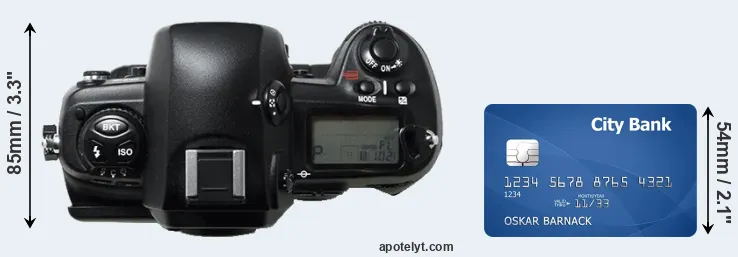 The side-by-side display below illustrates the physical size of the Nikon D1H vis-à-vis a credit card. Three successive views from the front, the top, and the rear are shown. All size dimensions are rounded to the nearest millimeter.