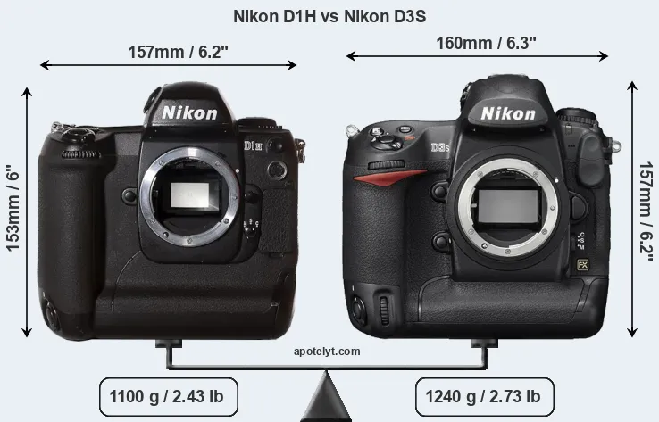 If the front view area (width x height) of the cameras is taken as an aggregate measure of their size, the Nikon D3S is somewhat larger (5 percent) than the Nikon D1H. Moreover, the D3S is markedly heavier (13 percent) than the D1H. In this context, it is worth noting that both cameras are splash and dust-proof and can, hence, be used in inclement weather conditions or harsh environments.
