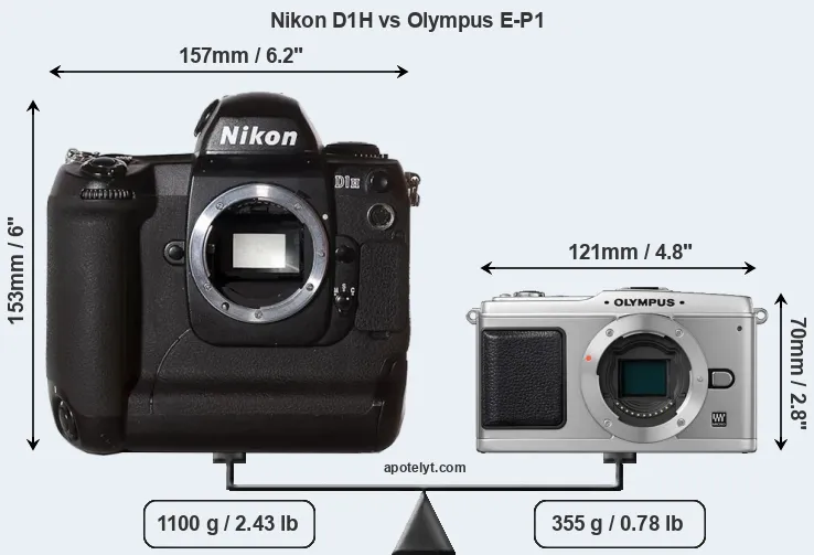 The side-by-side display below illustrates the physical size and weight of the Nikon D1H and the Olympus E-P1. The two cameras are presented according to their relative size. Three successive views from the front, the top, and the rear are shown. All width, height and depth measures are rounded to the nearest millimeter.