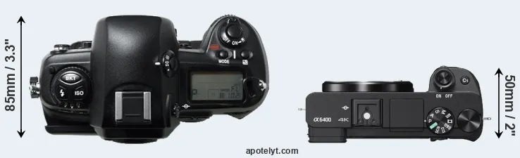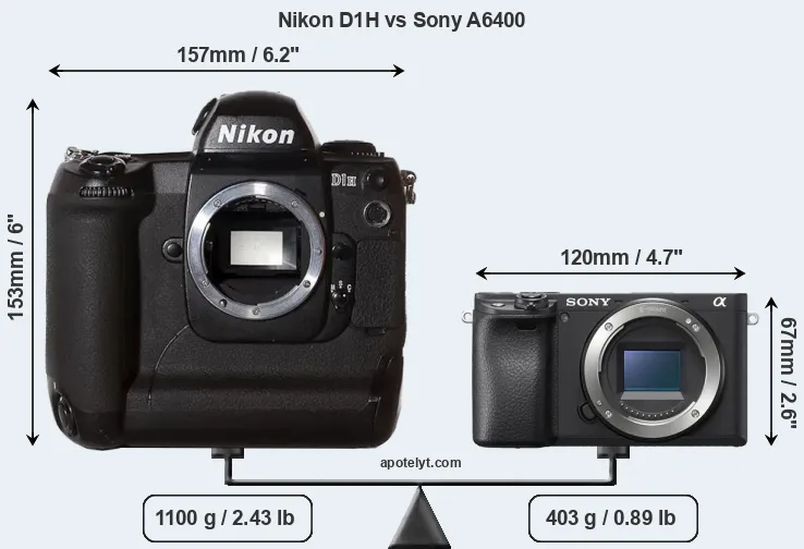 An illustration of the physical size and weight of the Nikon D1H and the Sony A6400 is provided in the side-by-side display below. The two cameras are presented according to their relative size. Three consecutive views from the front, the top, and the rear side are shown. All width, height and depth measures are rounded to the nearest millimeter.