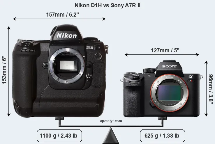 The side-by-side display below illustrates the physical size and weight of the Nikon D1H and the Sony A7R II. The two cameras are presented according to their relative size. Three successive views from the front, the top, and the rear are shown. All width, height and depth dimensions are rounded to the nearest millimeter.