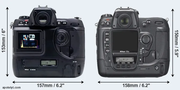 | 4. | Nikon D1H | 157 mm | 153 mm | 85 mm | 1100 g | 1200 | Y | Feb 2001 | US$ 4 499 | ebay.com | |