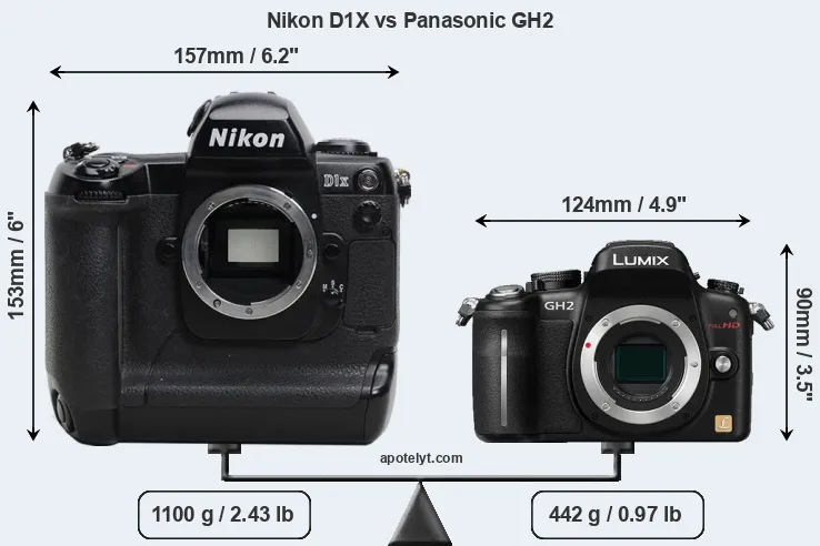 The physical size and weight of the Nikon D1X and the Panasonic GH2 are illustrated in the side-by-side display below. The two cameras are presented according to their relative size. Three consecutive views from the front, the top, and the rear side are shown. All width, height and depth dimensions are rounded to the nearest millimeter.