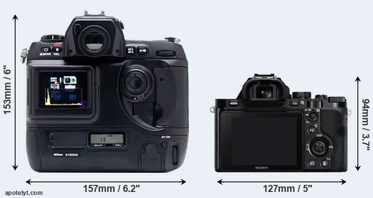 The physical size and weight of the Nikon D1X and the Sony A7 are illustrated in the side-by-side display below. The two cameras are presented according to their relative size. Three consecutive perspectives from the front, the top, and the back are available. All size dimensions are rounded to the nearest millimeter.