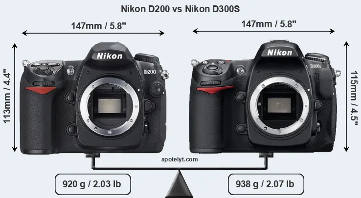 An illustration of the physical size and weight of the Nikon D200 and the Nikon D300S is provided in the side-by-side display below. The two cameras are presented according to their relative size. Three consecutive views from the front, the top, and the rear side are shown. All width, height and depth measures are rounded to the nearest millimeter.