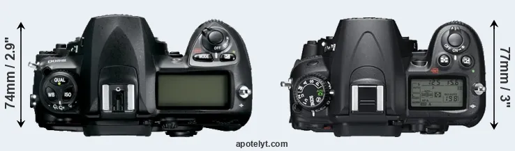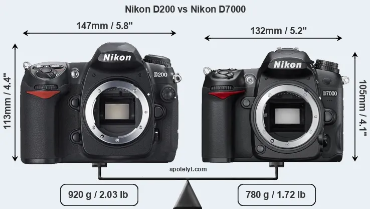 The physical size and weight of the Nikon D200 and the Nikon D7000 are illustrated in the side-by-side display below. The two cameras are presented according to their relative size. Three consecutive perspectives from the front, the top, and the back are available. All width, height and depth dimensions are rounded to the nearest millimeter.