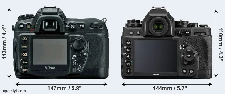The physical size and weight of the Nikon D200 and the Nikon Df are illustrated in the side-by-side display below. The two cameras are presented according to their relative size. Three consecutive perspectives from the front, the top, and the back are available. All width, height and depth dimensions are rounded to the nearest millimeter.