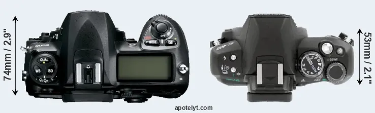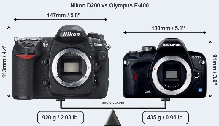 The physical size and weight of the Nikon D200 and the Olympus E-400 are illustrated in the side-by-side display below. The two cameras are presented according to their relative size. Three consecutive perspectives from the front, the top, and the back are available. All width, height and depth measures are rounded to the nearest millimeter.
