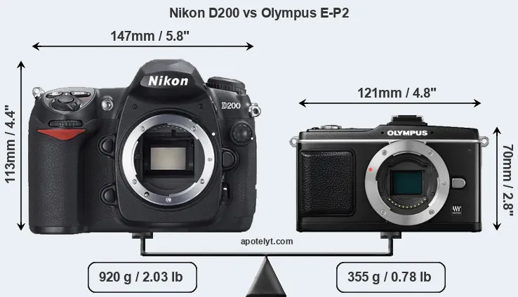 The side-by-side display below illustrates the physical size and weight of the Nikon D200 and the Olympus E-P2. The two cameras are presented according to their relative size. Three successive views from the front, the top, and the rear are shown. All width, height and depth measures are rounded to the nearest millimeter.