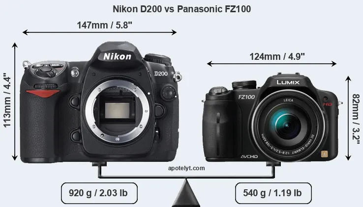 An illustration of the physical size and weight of the Nikon D200 and the Panasonic FZ100 is provided in the side-by-side display below. The two cameras are presented according to their relative size. Three consecutive views from the front, the top, and the rear side are shown. All width, height and depth measures are rounded to the nearest millimeter.