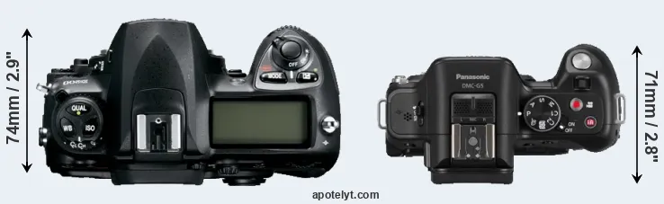 The side-by-side display below illustrates the physical size and weight of the Nikon D200 and the Panasonic G5. The two cameras are presented according to their relative size. Three successive views from the front, the top, and the rear are shown. All width, height and depth measures are rounded to the nearest millimeter.