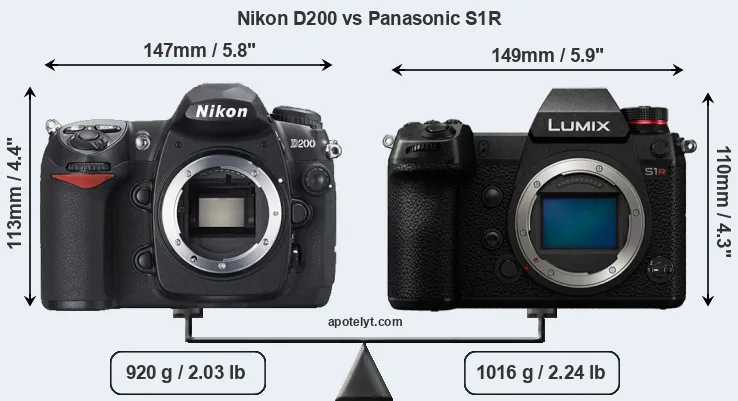 An illustration of the physical size and weight of the Nikon D200 and the Panasonic S1R is provided in the side-by-side display below. The two cameras are presented according to their relative size. Three successive views from the front, the top, and the rear are shown. All size dimensions are rounded to the nearest millimeter.