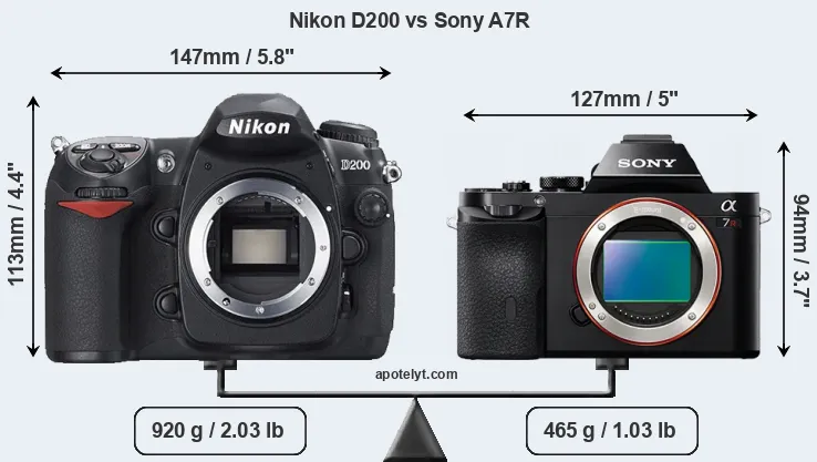 The physical size and weight of the Nikon D200 and the Sony A7R are illustrated in the side-by-side display below. The two cameras are presented according to their relative size. Three successive views from the front, the top, and the rear are shown. All width, height and depth measures are rounded to the nearest millimeter.