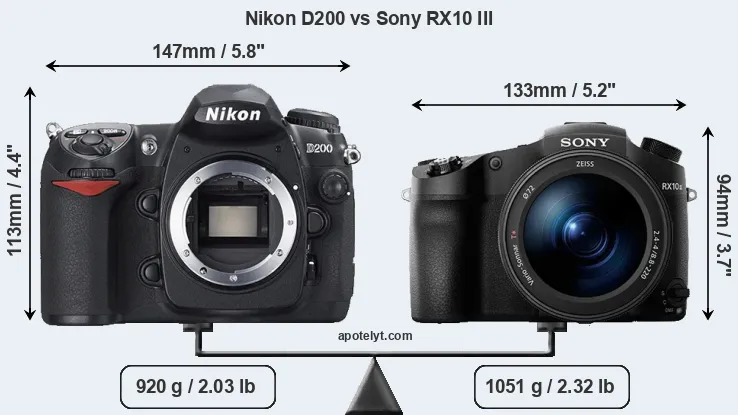 The side-by-side display below illustrates the physical size and weight of the Nikon D200 and the Sony RX10 III. The two cameras are presented according to their relative size. Three consecutive perspectives from the front, the top, and the back are available. All width, height and depth dimensions are rounded to the nearest millimeter.