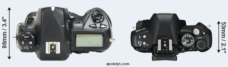 The physical size and weight of the Nikon D2H and the Olympus E-450 are illustrated in the side-by-side display below. The two cameras are presented according to their relative size. Three consecutive views from the front, the top, and the rear side are shown. All size dimensions are rounded to the nearest millimeter.