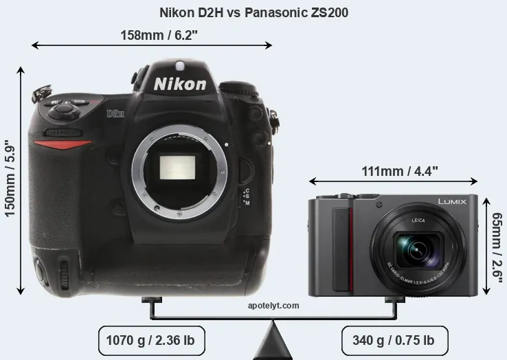 The side-by-side display below illustrates the physical size and weight of the Nikon D2H and the Panasonic ZS200. The two cameras are presented according to their relative size. Three consecutive perspectives from the front, the top, and the back are available. All width, height and depth measures are rounded to the nearest millimeter.