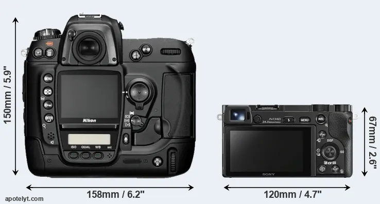 The side-by-side display below illustrates the physical size and weight of the Nikon D2H and the Sony A6000. The two cameras are presented according to their relative size. Three successive views from the front, the top, and the rear are shown. All size dimensions are rounded to the nearest millimeter.