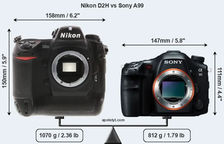 An illustration of the physical size and weight of the Nikon D2H and the Sony A99 is provided in the side-by-side display below. The two cameras are presented according to their relative size. Three consecutive views from the front, the top, and the rear side are shown. All width, height and depth dimensions are rounded to the nearest millimeter.