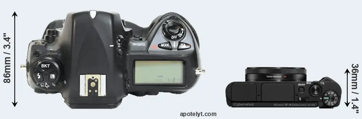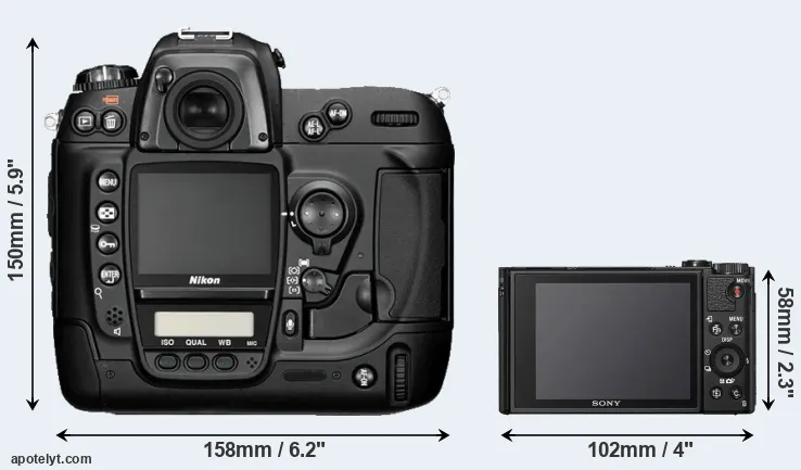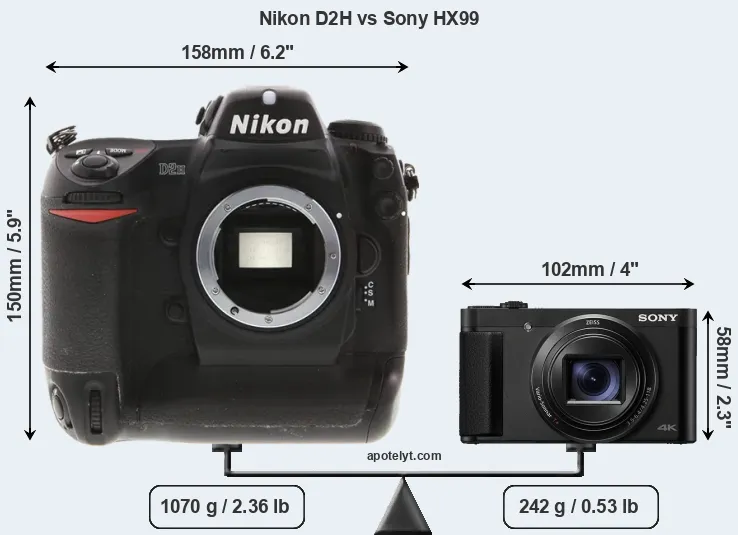 The physical size and weight of the Nikon D2H and the Sony HX99 are illustrated in the side-by-side display below. The two cameras are presented according to their relative size. Three consecutive views from the front, the top, and the rear side are shown. All size dimensions are rounded to the nearest millimeter.