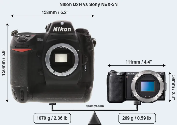 An illustration of the physical size and weight of the Nikon D2H and the Sony NEX-5N is provided in the side-by-side display below. The two cameras are presented according to their relative size. Three successive views from the front, the top, and the rear are shown. All width, height and depth measures are rounded to the nearest millimeter.