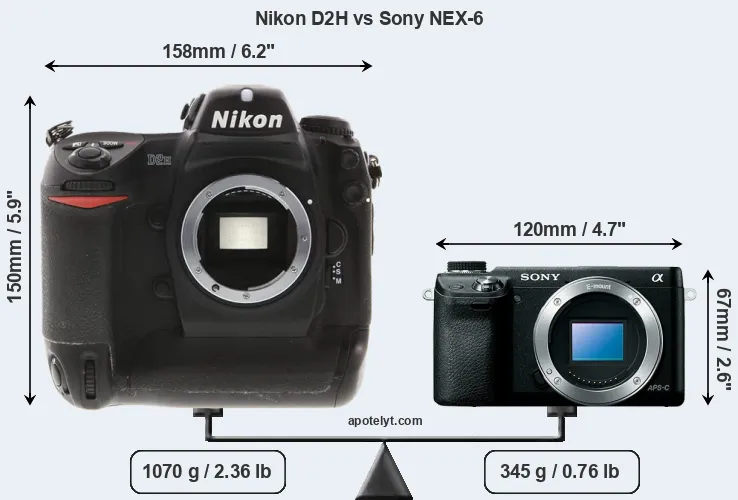 If the front view area (width x height) of the cameras is taken as an aggregate measure of their size, the Sony NEX-6 is considerably smaller (66 percent) than the Nikon D2H. Moreover, the NEX-6 is substantially lighter (68 percent) than the D2H. It is worth mentioning in this context that the D2H is splash and dust resistant, while the NEX-6 does not feature any corresponding weather-sealing.