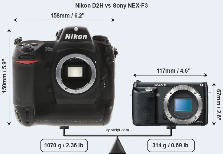 The side-by-side display below illustrates the physical size and weight of the Nikon D2H and the Sony NEX-F3. The two cameras are presented according to their relative size. Three consecutive perspectives from the front, the top, and the back are available. All size dimensions are rounded to the nearest millimeter.