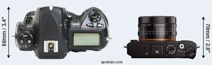 The side-by-side display below illustrates the physical size and weight of the Nikon D2H and the Sony RX1. The two cameras are presented according to their relative size. Three consecutive views from the front, the top, and the rear side are shown. All width, height and depth measures are rounded to the nearest millimeter.