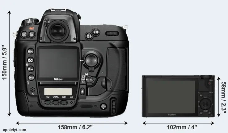 The physical size and weight of the Nikon D2H and the Sony RX100 are illustrated in the side-by-side display below. The two cameras are presented according to their relative size. Three consecutive views from the front, the top, and the rear side are shown. All width, height and depth dimensions are rounded to the nearest millimeter.