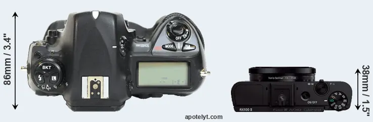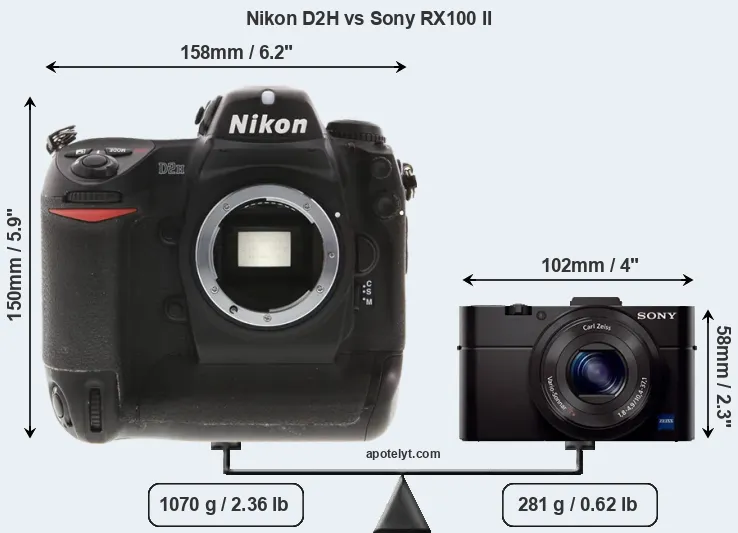 The physical size and weight of the Nikon D2H and the Sony RX100 II are illustrated in the side-by-side display below. The two cameras are presented according to their relative size. Three consecutive views from the front, the top, and the rear side are shown. All width, height and depth dimensions are rounded to the nearest millimeter.