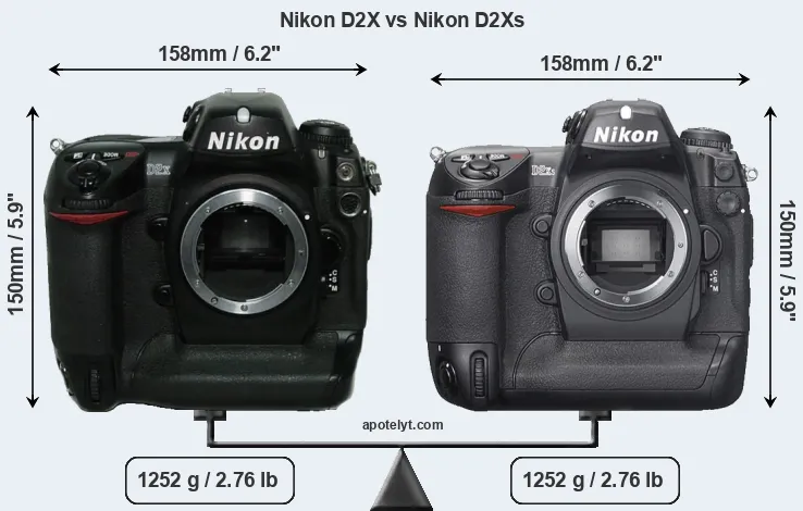 The side-by-side display below illustrates the physical size and weight of the Nikon D2X and the Nikon D2Xs. The two cameras are presented according to their relative size. Three consecutive perspectives from the front, the top, and the back are available. All size dimensions are rounded to the nearest millimeter.