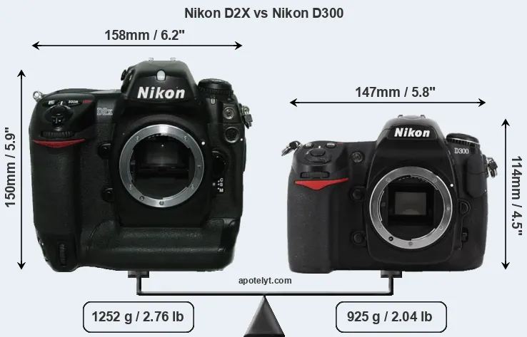 The physical size and weight of the Nikon D2X and the Nikon D300 are illustrated in the side-by-side display below. The two cameras are presented according to their relative size. Three consecutive perspectives from the front, the top, and the back are available. All size dimensions are rounded to the nearest millimeter.