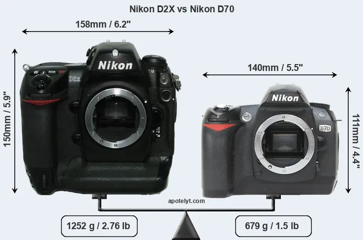 If the front view area (width x height) of the cameras is taken as an aggregate measure of their size, the Nikon D70 is considerably smaller (34 percent) than the Nikon D2X. Moreover, the D70 is substantially lighter (46 percent) than the D2X. It is worth mentioning in this context that the D2X is splash and dust resistant, while the D70 does not feature any corresponding weather-sealing.
