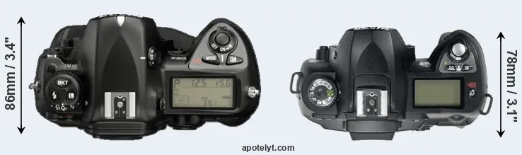 The physical size and weight of the Nikon D2X and the Nikon D70 are illustrated in the side-by-side display below. The two cameras are presented according to their relative size. Three consecutive views from the front, the top, and the rear side are shown. All width, height and depth dimensions are rounded to the nearest millimeter.