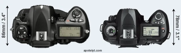 The physical size and weight of the Nikon D2X and the Nikon D70s are illustrated in the side-by-side display below. The two cameras are presented according to their relative size. Three consecutive views from the front, the top, and the rear side are shown. All width, height and depth dimensions are rounded to the nearest millimeter.