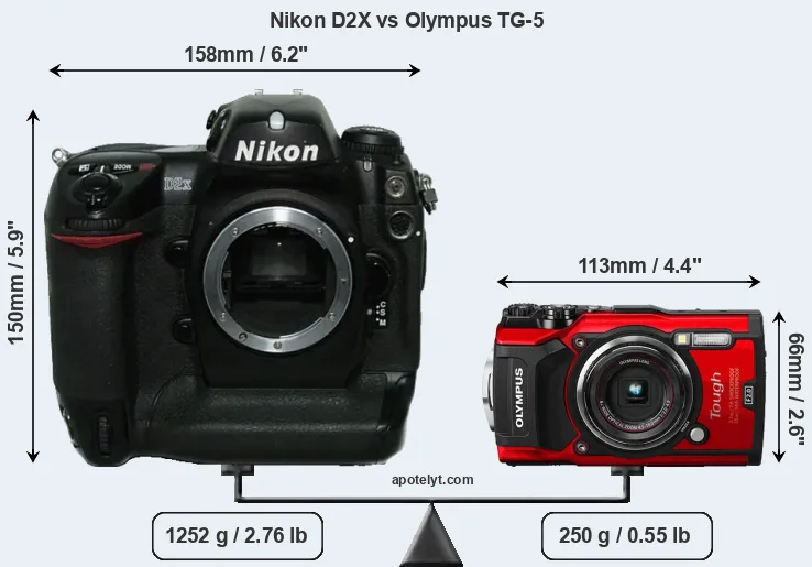 An illustration of the physical size and weight of the Nikon D2X and the Olympus TG-5 is provided in the side-by-side display below. The two cameras are presented according to their relative size. Three consecutive views from the front, the top, and the rear side are shown. All width, height and depth dimensions are rounded to the nearest millimeter.