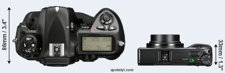 The side-by-side display below illustrates the physical size and weight of the Nikon D2X and the Ricoh GR III. The two cameras are presented according to their relative size. Three consecutive perspectives from the front, the top, and the back are available. All size dimensions are rounded to the nearest millimeter.
