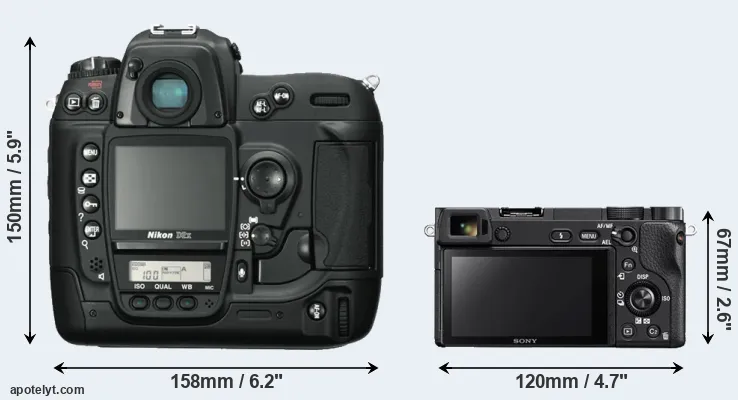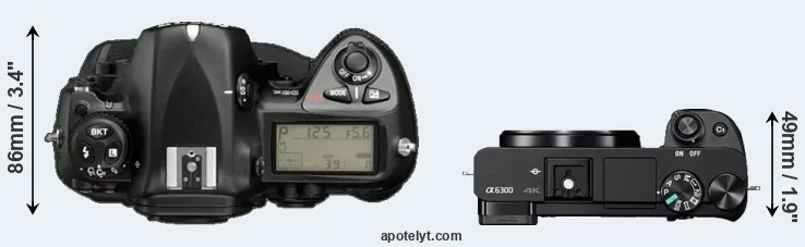 An illustration of the physical size and weight of the Nikon D2X and the Sony A6300 is provided in the side-by-side display below. The two cameras are presented according to their relative size. Three successive views from the front, the top, and the rear are shown. All width, height and depth dimensions are rounded to the nearest millimeter.
