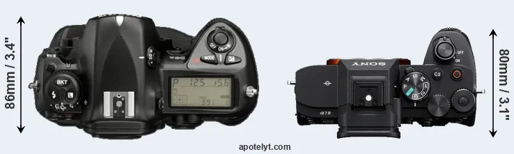 The side-by-side display below illustrates the physical size and weight of the Nikon D2X and the Sony A7 IV. The two cameras are presented according to their relative size. Three successive views from the front, the top, and the rear are shown. All width, height and depth dimensions are rounded to the nearest millimeter.
