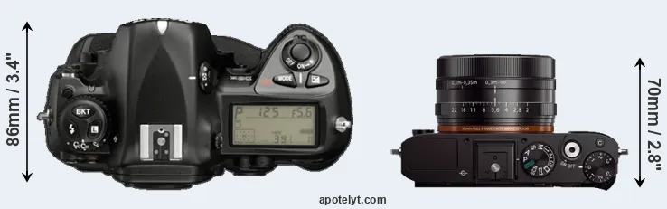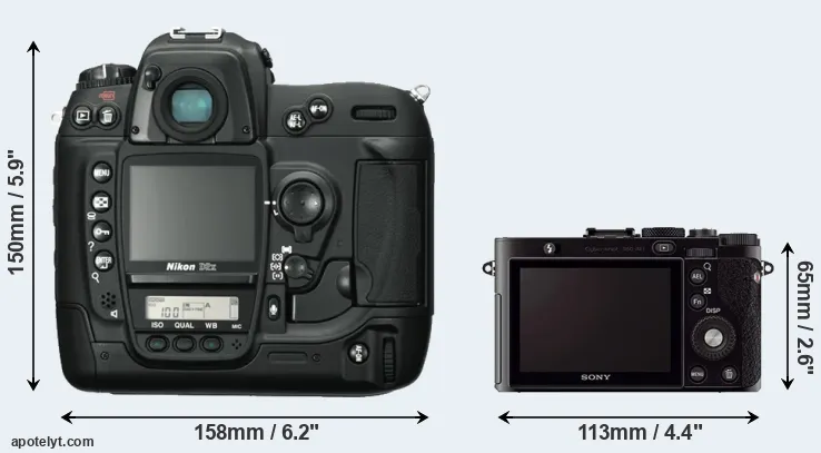 The side-by-side display below illustrates the physical size and weight of the Nikon D2X and the Sony RX1. The two cameras are presented according to their relative size. Three successive views from the front, the top, and the rear are shown. All width, height and depth dimensions are rounded to the nearest millimeter.