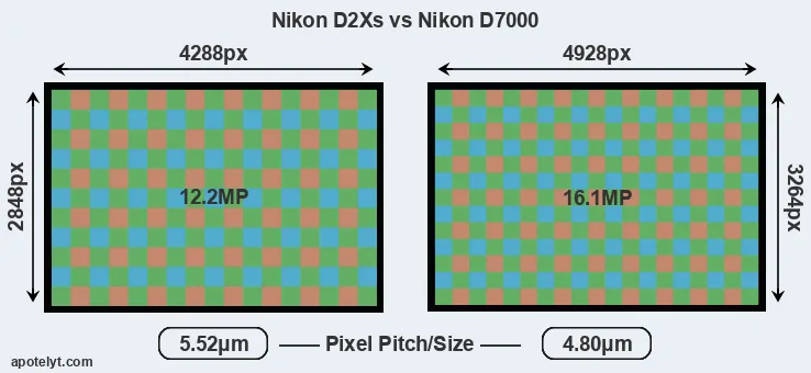 Despite having a slightly smaller sensor, the D7000 offers a higher resolution of 16.1 megapixels, compared with 12.2 MP of the D2Xs. This megapixels advantage comes at the cost of a higher pixel density and a smaller size of the individual pixel (with a pixel pitch of 4.80μm versus 5.52μm for the D2Xs). However, it should be noted that the D7000 is much more recent (by 4 years and 3 months) than the D2Xs, and its sensor will have benefitted from technological advances during this time that make it possible to gather light more efficiently.